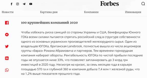 Но главное – остались пока ещё и "Запорожсталь" (11-е место в сотне крупнейших компаний Украины), которая, как утверждают украинские СМИ, принадлежит не только Ахметову, но и неким инвесторам из России, и Южный горно-обогатительный комбинат (16-е место). По поводу последнего Forbes.ua утверждает, что в числе его совладельцев значатся Ринат Ахметов, Вадим Новинский, а также – внимание! – Роман Абрамович, Александр Абрамов, Александр Фролов.