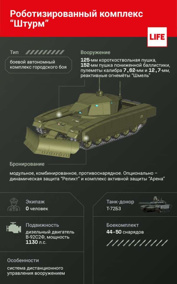 Главная новинка сухопутных сил, по некоторым данным, может быть представлена уже в конце мая. Роботизированный комплекс "Штурм" для работы подразделений в городских условиях отличается от обычного танка по целому ряду параметров, хотя формально машина построена на том же шасси танка Т-72. Отличительная особенность "Штурма" — специальная укороченная 125-миллиметровая пушка с расширенным боекомплектом. Исключение экипажа из системы управления позволило расширить боекомплект — вместо 39 выстрелов в ниши через специальную систему подачи может быть загружено от 44 до 50 унитарных выстрелов, которые пригодятся для активного штурма защищённых объектов.