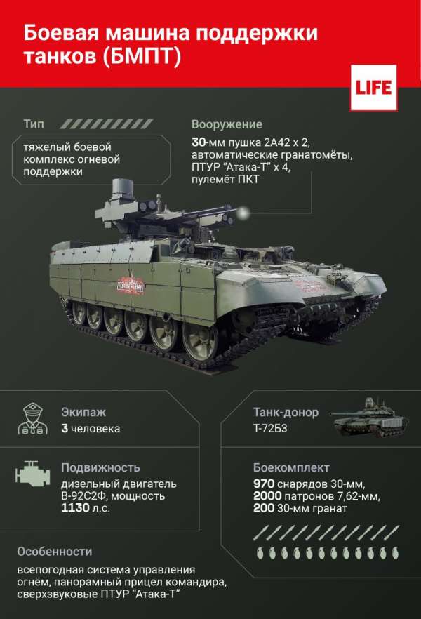 Отличительная особенность БМПТ — комбинированный комплекс вооружения. Спаренные 30-миллиметровые пушки позволяют уничтожать живую силу противника, а сверхзвуковые противотанковые ракеты "Атака-Т" — танки противника с почтительного расстояния в 6–8 километров. При этом БМПТ может находиться как на замаскированной позиции, так и в движении — система стабилизации точно наводит ракеты на цель, а панорамный прицел командира охватывает широким углом практически весь участок, на котором подразделение "принимает" танки противника.