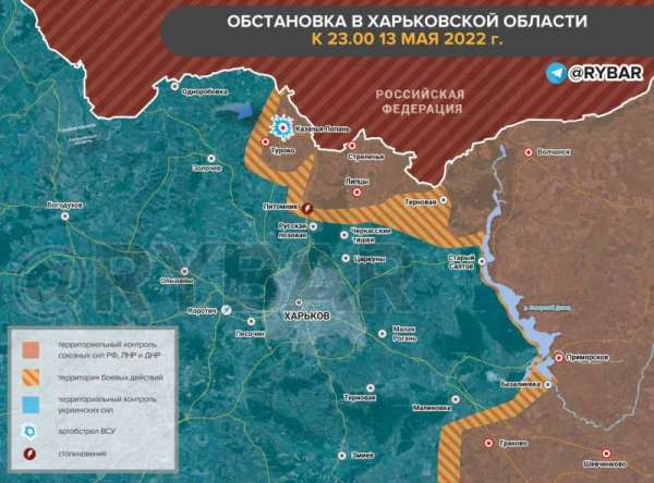 Обзор ситуации по боям в Харьковской области и сложившейся ситуации на фронте, вечером 13 мая опубликовал телеграм-канал «Рыбaрь».