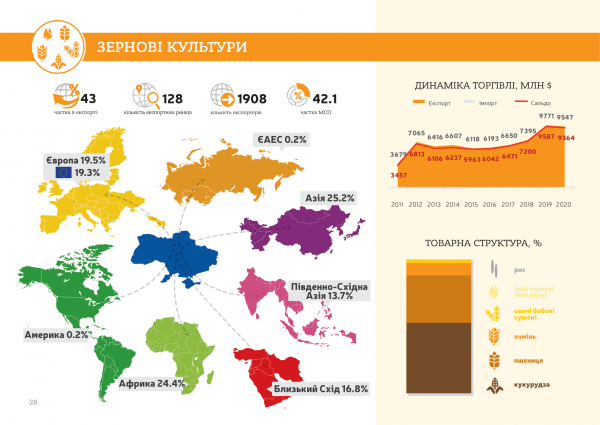 С 2018 года по 1 октября 2021 года Украина экспортировала более 180 млн т кукурузы, пшеницы и ячменя. Основными потребителями украинских зерновых является Африка, Азия, Ближний Восток и Европа.