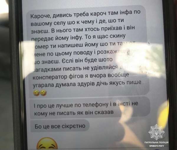 Точно такой же фантасмагорический отчёт об очередной перемоге над «информатором оккупантов» выложила в сеть Нацполиция соседнего Кривого Рога. При патрулировании в Саксаганском районе был остановлен автомобиль ВАЗ. Далее на ясном глазу рассказывается, как у водителя во время проверки телефона инспекторы обнаружили переписку с российскими военными: «Этот оборотень должен был передавать информацию о своём посёлке в Херсонской области!»