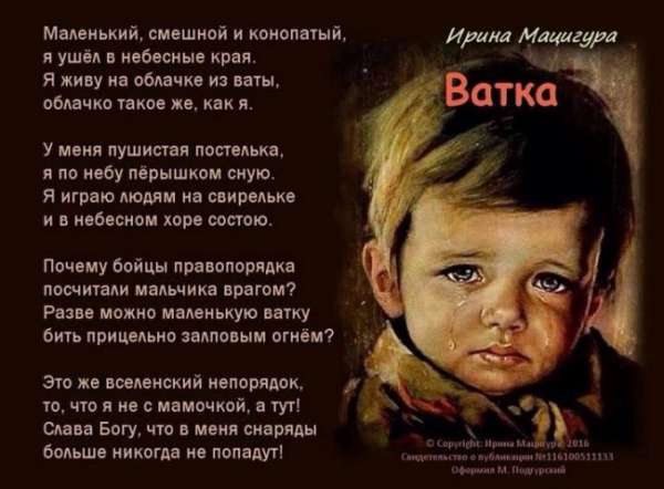 …А детей Донбасса и Украины по-любому жальче всего. Они – самая невинная жертва игрищ взрослых. Тот убитый потенциал, который, может быть, уже никогда не сделает этот мир добрее и лучше. А выжил – смог бы…
