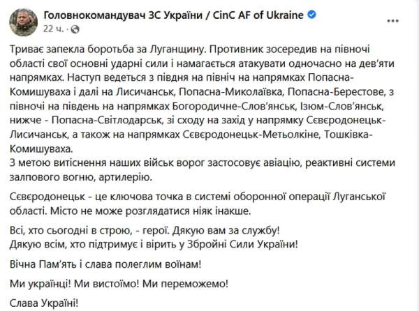 Об этом генерал Залужный написал в запрещённой в РФ соцсети Facebook.