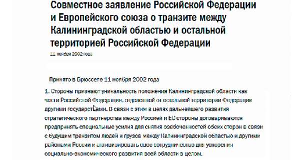 В этом документе – сразу в первом же пункте – указывается, что "стороны (ЕС и Россия) признают уникальность положения Калининградской области как части России, отделённой от остальной территории Федерации другими государствами". А потому принимаются специальные условия по будущему транзиту людей и грузов между Калининградской областью и другими районами России".