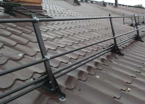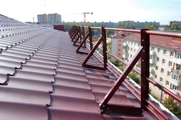 Безопасность кровли, вернее любых работ от очистки снега, до проверки состояния покрытия обеспечивают кровельные ограждения – сборные металлоконструкции, состоящие из отдельных секций, устанавливаемые по периметру крыши. Они же – дополнительные снегозадержатели, разбивающие крупные снежные пласты на небольшие, безопасные фрагменты.