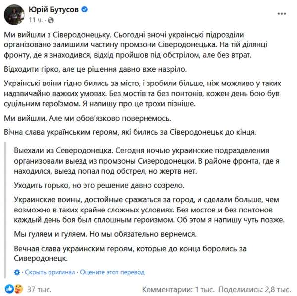 Украинский пропагандист Юрий Бутусов сообщил, что ВСУшники ночью 24 июня покинули часть промзоны и вышли из Северодонецка.