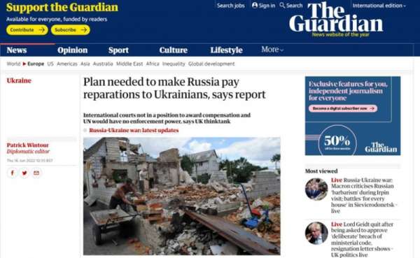 В публикации говорится, что этот доклад — одно из первых подробных исследований того, как могут работать репарации для Украины. Британские аналитики впервые попытались профессионально разобраться в вопросе репарации и пришли к неутешительному для Киева выводу: в создании глобального механизма, требующего от России выплаты компенсаций Украине, «нет никакого прогресса». Невыясненным остаётся и вопрос о том, какая институция теоретически могла бы присудить России выплату репараций.