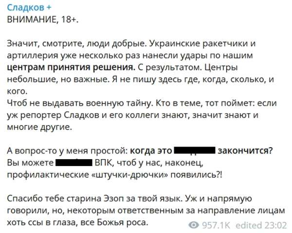 «Значит, смотрите, люди добрые. Украинские ракетчики и артиллерия уже несколько раз нанесли удары по нашим центрам принятия решения. С результатом. Центры небольшие, но важные. Я не пишу здесь где, когда, сколько и кого, чтобы не выдавать военную тайну», - заявил он. Более того, Сладков возмущен систематическими ракетными и артиллерийскими ударами, которые сопровождаются гибелью офицерского и личного состава армии РФ, а также наносят тяжелый урон российской армии.