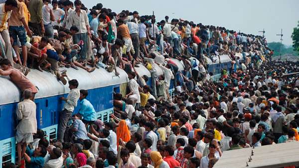 Речь идёт не о нижних и верхних полках, забитых как сардинами сидящими пассажирами, а о пространстве в коридоре, внутри и вокруг них. Люди выдерживали "второй этаж" на своей голове и плечах только потому, что были стиснуты и притиснуты друг к другу со всех сторон. На крыше вагона, конечно, ехать было лучше. Поезд пришлось брать штурмом, с мордобоем. "Зайцы" напирали со всех сторон, билетов не было почти ни у кого. Так я ехал с группой советских студентов из Махараштры в Тамилнад, проведя предварительно ночь с походной сумкой в виде подушки на полу грязного вокзала в городе Пуна, так как в первый следовавший в нужном направлении поезд пробиться не удалось.