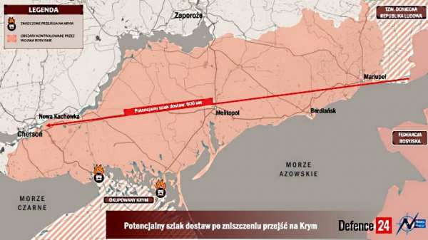 Тем более, что такое перемещение боеприпасов и горючего из России будет затруднительно, потому что будет организовано через одну коммуникационную развязку в Мелитополе. При контроле этого узла и блокировке артиллерийскими системами снабжения из Крыма, российская военная группировка, растянувшаяся на расстояние более 200 км, будет отрезана от снабжения.