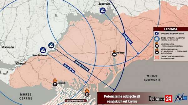 Во втором случае системы HIMARS позволят полностью контролировать западный выход с Крымского полуострова и перекрыть снабжение российских войск. Первоначально возможно взять под контроль только дороги в западной части Крымского перешейка за населенным пунктом Армянск (таким образом, блокируя транспорт в сторону Херсона).