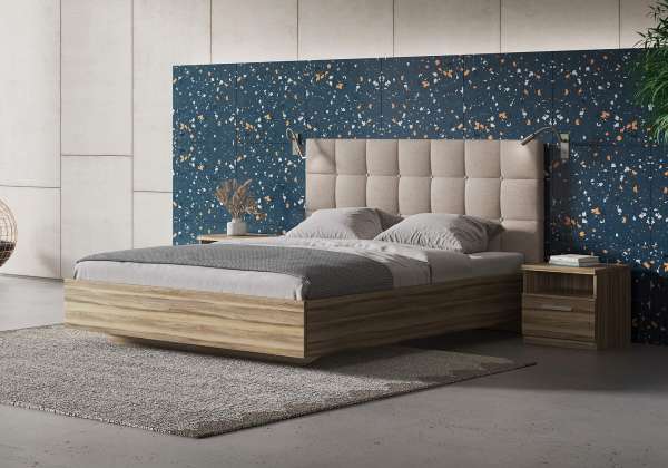 Комбинированная кровать, сочетающая в себе самые высокие требования покупателей. Изголовье обито тканью, украшено пуговицами в тон, что придает модели особого лоска и шика. Дополняет композицию деревянное основание. Прямые линии, сочетание различных материалов, красивые оттенки делают кровать настоящим украшением комнаты. Спальное место обеспечивает максимальный уровень комфорта во время сна и отдыха. Широкое, практичное, надежное. Ну а для обеспечения максимального уровня практичности, кровать всегда можно дополнить подъемным механизмом с бельевыми ящиками.