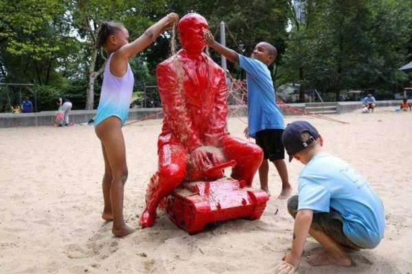 Ну и, конечно же, искусство не могло пройти мимо этого зудящего феномена. На одной из детских площадок Центрального парка в Нью-Йорке 1 августа сего года появилась ярко-красная скульптура президента России Владимира Путина, который сидит на небольшом красном же танке.