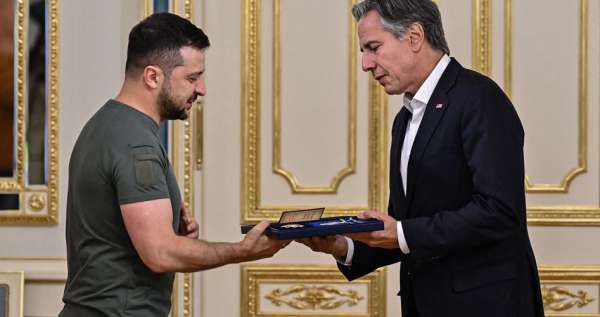 Украинский недопрезидент Зеленский (ни на йоту не выполнены предвыборные обещания! Хитрый и коварный комик из местечка пробрался на высшую должность, чтобы вконец уничтожить остатки Советской Украины и на блюдечке предложить то, что от неё осталось, США и "Израилю") поделился с американским эмиссаром - госсекретарём Блинкином "мудростью". Он наградил того орденом Ярослава Мудрого II степени.