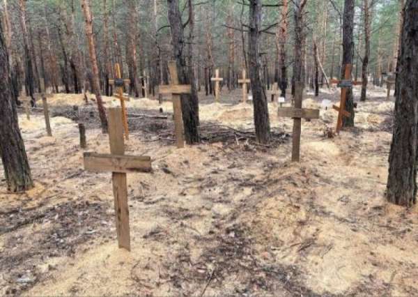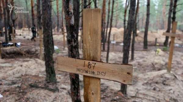 По данным полиции под Изюмом на Харьковщине обнаружили массовое захоронение из более чем 400 могил, среди которых 20-25 погибших военных ВСУ. Тела покоились отдельно на импровизированном участке. Сказано также, что полиция также знает о ряде других захоронений.