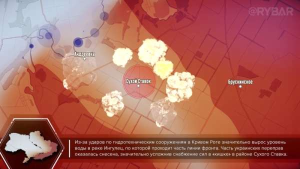 По информации издания, из-за ударов по гидротехническим сооружениям в Кривом Роге значительно вырос уровень воды в реке Ингулец, которая снесла минимум часть украинских переправ. Это сильно осложнило снабжение украинских формирований в «кишке» в окрестностях Сухого Ставка.