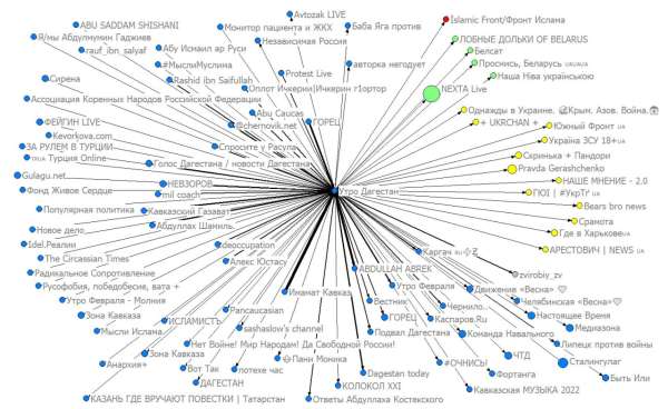 Упоминания на ютубе у Арестовича с Фейгиным, белорусская оппозиция (зеленым), весь зоопарк беглой российской оппозиции, плюс каналы этнонациональной и религиозной тематики.