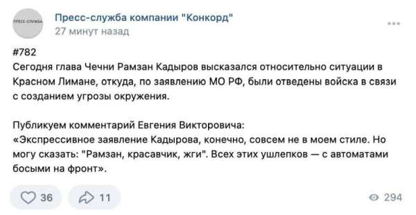 Предприниматель и основатель ЧВК «Вагнер» Евгений Пригожин поддержал главу Чечни и призвал отправить тех, кто отвечал за оборону Красного Лимана, «с автоматами босыми на фронт».