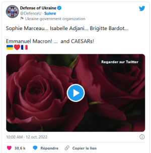 При этом само видео предваряет надпись: «Софи Марсо... Изабель Аджани... Брижит Бардо... Эммануэль Макрон! ... и «Цезари»!», — такой неуместный ряд симпатий выстроили пиарщики ВСУ, объединив имена звезд французского кино с президентом Франции, снабжающим Украину оружием, и смертоносными системами «Цезарь». «Большое спасибо, Франция», — завершается французский клип с фотографиями президентов Франции и Украины, а затем продолжается на английском: «Пришлите еще, пожалуйста».
