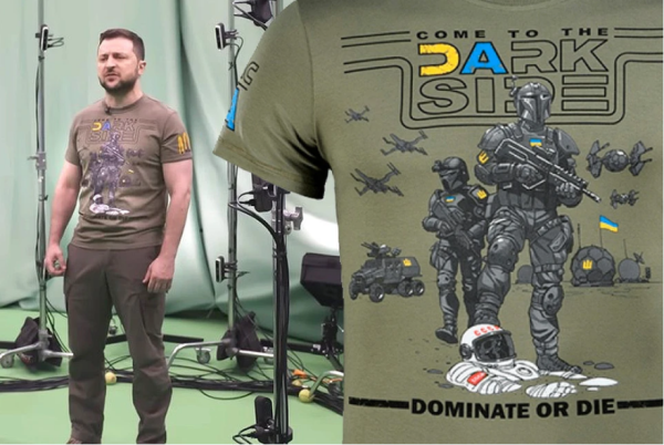 На прошлой неделе в соцсетях и СМИ обсуждали футболку Зеленского, в которой он записывал какое-то свое очередное обращение. Что он там говорил, абсолютно неинтересно, а вот вся идеология нынешнего украинского режима, да и всего Запада, внезапно оказалась отраженной на майке. А на майке изображены какие-то киборги и летательные аппараты, стилизованные под «Звездные войны», раскрашенные в желто-синие цвета нынешнего украинского флага. Надпись гласит: «Come to the dark side. Dominate or die» — «Переходи на темную сторону. Господствуй или умри». При этом киборги втаптывают в грязь космонавта с надписью «СССР» на шлеме, наступают ему на голову.