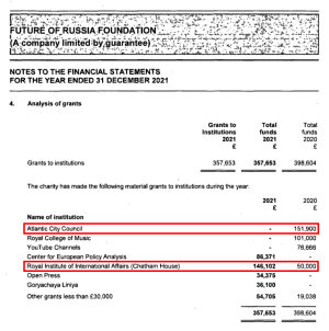 Фонд Ходорковского также спонсирует работу аналитического центра Chatham House (Королевский институт международных отношений), который, как и Атлантический Совет, занимается подрывной деятельностью в РБ и РФ. На него в 2021 году было потрачено 146 102 фунтов стерлингов.