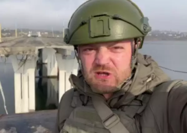 «Вероятно, он был подорван во время вывода российской группировки с правого берега на левый берег», — рассказал журналист, стоя на фоне моста. По его словам, сейчас на правом берегу Днепра российских войск не осталось, а украинские подразделения еще не вышли к мосту.