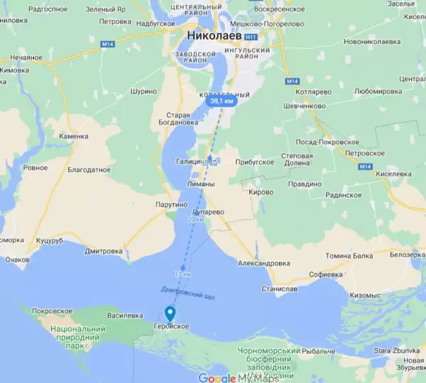 Кинбурнская коса, которую контролируют ВС РФ, находится напротив Очакова. От Кинбурнского полуострова до ближайшего к нему Корабельного района Николаева менее 40 километров.