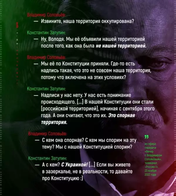 «Минуточку, что в Конституции написано? По Конституции это наша территория или нет? У нас что, где-то есть надпись такая, что это не совсем наша территория, потому что включена в этих условиях?», - возмутился ведущий. После чего Затулин равнодушно и многозначительно ответил, что «у всех должно быть понимание происходящего». Разгневанный Соловьев спросил у Затулина, «будет ли тот считать угрозой, если ВСУ вступят на территорию Крыма, Белгорода или Курска?». «Это другая история», - сморщившись от вопроса, как от кислого яблока, заявил Затулин и продолжил мысль, что ВС РФ обрели контроль над двумя украинскими областями «в процессе военных действий», но противоположная сторона по-прежнему считает их своей территорией, поэтому она является «спорной». Часть приглашенных в студию экспертов при этом пассаже молча опустили головы, а Владимир Соловьев прямо обвинил депутата в презрении к Конституции РФ.