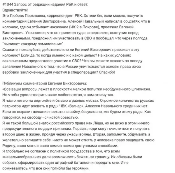 В пресс-службу компании "Конкорд", принадлежащей Пригожину, поступил запрос от сислибовского издания РБК: "Это Любовь Порываева, корреспондент РБК. Хотели бы, если можно, получить комментарий Евгения Викторовича. Алексей Навальный написал в соцсетях, что в колонию, где он отбывает наказание, приезжал Евгений Викторович. Уточняется, что он прилетел туда на вертолёте, выступил перед заключенными, предложил им участвовать в СВО и пообещал, что через полгода «выпишет каждому помилование». Скажите, пожалуйста, действительно ли Евгений Викторович приезжал в эту колонию? Если да, то когда именно и с какой целью? На каких условиях заключённым предлагалось участие в СВО? Что вы можете сказать по поводу заявления Навального о том, что в России уничтожаются основы права из-за вербовки заключенных для участия в спецоперации? Спасибо!"