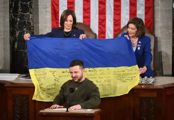Речь закончилась тем, что вице-президент Камала Харрис и уходящий спикер Палаты представителей Нэнси Пелоси подняли украинский флаг, который им подарил Зеленский. Этот же флаг был подарен Зеленскому всего несколько дней назад солдатами в Бахмуте, небольшом городе на востоке Украины, расположенном на передовой линии борьбы с Россией.