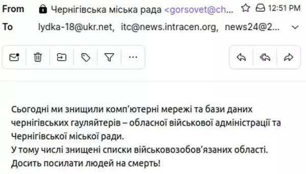 «Сегодня мы уничтожили компьютерные сети и базы данных черниговских гауляйтеров — областной военной администрации и Черниговского городского совета. В том числе уничтожены списки военнообязанных области. Хватит посылать людей на смерть!» — говорится в сообщении сетевых взломщиков.