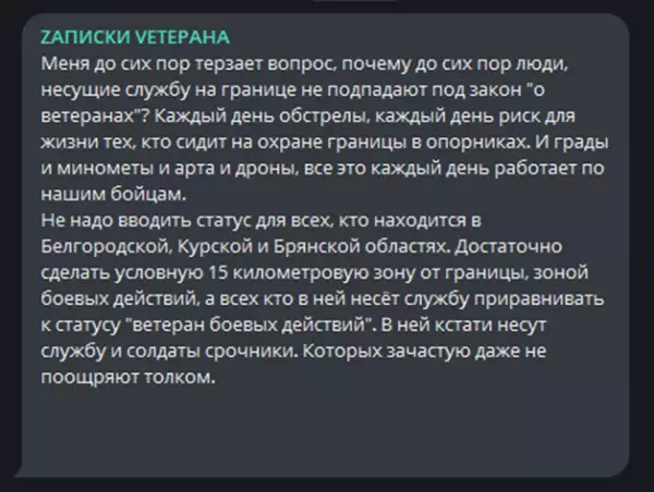 «Записки Ветерана» же предлагает сделать условную 15-километровую зону от границы зоной боевых действий и наделить всех, кто несет службу в этой зоне, статусом ветерана БД, ведь на этой территории «каждый день обстрелы, каждый день риск для жизни».