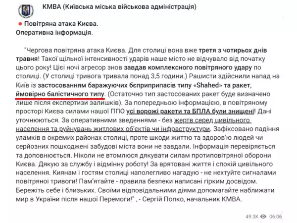 Об атаке Киева в эту ночь официально сообщила Киевская городская военная администрация, отметив, что в атаке, кроме дронов-камикадзе Shahed, были и ракеты Киевская городская военная администрация, "вероятно баллистического типа», — написало издание 5 мая, опубликовав скрин с сайта КГВА и фото обломков ракеты.