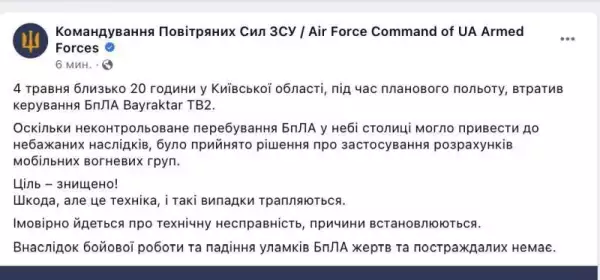 «4 мая около 20 часов в Киевской области, во время планового полета, потерял управление БпЛА Bayraktar TB2. Поскольку неконтролируемое пребывание БПЛА в небе столицы могло привести к нежелательным последствиям, было принято решение о применении расчетов мобильных огневых групп. Цель — уничтожена!» — подтвердили в ВВС Украины.