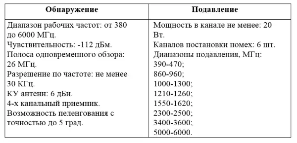 Особенности: перехват видеоизображения, следящая антенна система с поворотом в 360 град, в зависимости от комплектации 1-2 канала постановки широкополосных помех, встроенная база сигналов БПЛА.