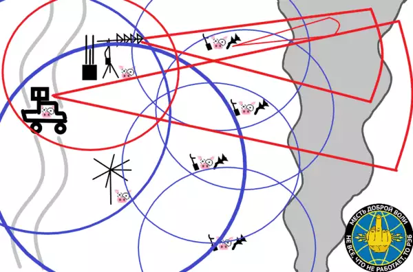 Не претендуем на точность, а пытаемся передать суть. Серая «река» — это серая зона. Синие круги – зоны разведки (они могут быть и в виде секторов, в зависимости от используемых антенн), очень сильная зависимость от рельефа местности, ну и, разумеется, от техники. Красные секторы – зоны радиоподавления.