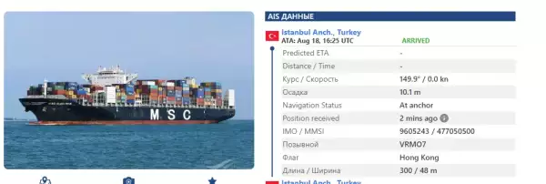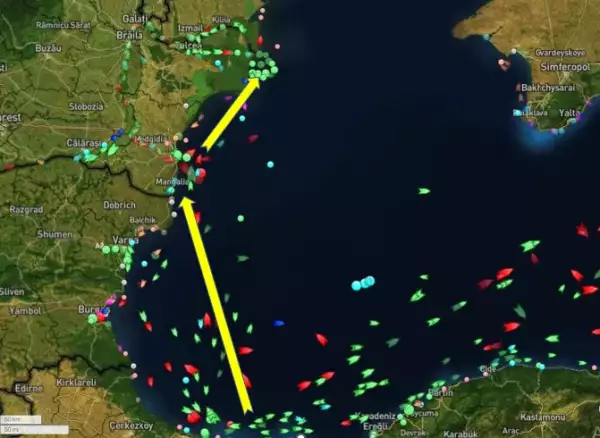 Онлайн карта движения судов в Чёрном море (жёлтым примерный маршрут)