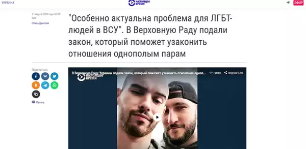 Один из материалов в украинских СМИ о важности легализации однополых браков в контексте "войны с Россией". Фото: скриншот сайта "Настоящее время"