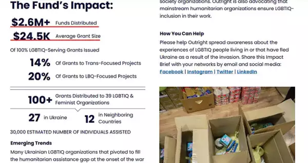 Сообщается также, что 20% грантов были направлены на поддержку содомитов и "бесполых" ("квир"-людей), а ещё 14% отдали трансвеститам. Средний размер гранта – 24,5 тыс. долларов.