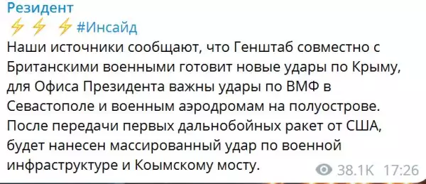 "Для Офиса президента важны удары по ВМФ в Севастополе и военным аэродромам на полуострове, - сообщает известный своими инсайдами из администрации Зеленского украинский Телеграм-канал "Резидент". - После передачи первых дальнобойных ракет от США будет нанесен массированный удар по военной инфраструктуре и Крымскому мосту".