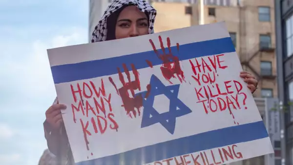 НАДПИСЬ НА ПЛАКАТЕ: "CКОЛЬКО ДЕТЕЙ ТЫ УБИЛ СЕГОДНЯ". ФОТО: STEPHEN ZENNER/GLОBALLООKPRЕSS