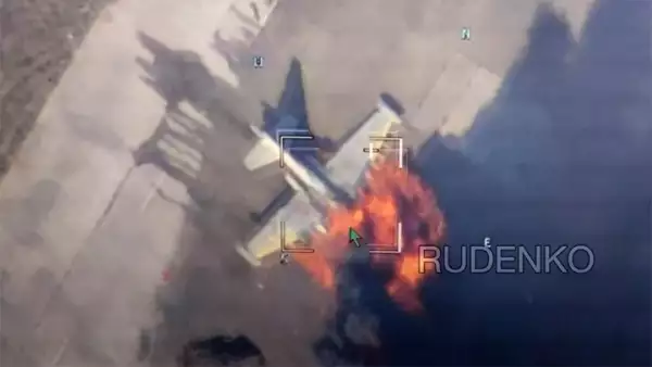 Кадры объективного контроля поражения украинского Су-25 барражирующим боеприпасом "Ланцет". Скриншот кадра видео тг-канала "Военкор Руденко"
