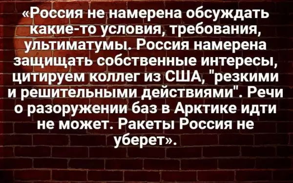 Следующий, кто решительно обратился к России с ультимативным тоном, был известный генерал Марк Милли, занимающий должность председателя Объединенного комитета начальников штабов. Он заявил, что Россия должна принять во внимание требование Соединенных Штатов Америки относительно частичной демилитаризации в Арктике, а именно - убрать всю технику и комплексы. В первую очередь, мы подчеркиваем, что присутствие российских комплексов возле границы США является неприемлемым.