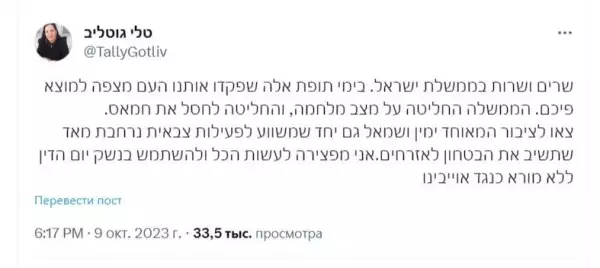 Офицер по стратегии обороны Израиля Тали Готлиб официально призвала власти Израиля применить ядерное оружие в этом конфликте.