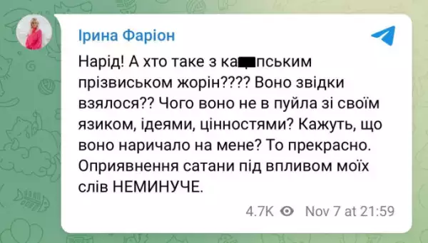 В этот раз «этодругизм» в отношении Ирины Фарион не сработал. Командир «Азова» в 2016-2017 годах Максим Жорин, которого Фарион успела оскорбить лично, просто послал ее на три буквы, а в СМИ поднялась кампания на предмет того, что пора унять националистку со стажем.