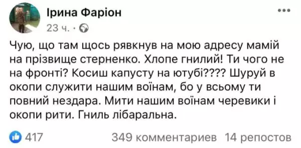 Мало того – если раньше она назвала русскоязычных ВСушников либо ленивыми, либо политически предвзятыми, либо «умственно отсталыми» и требовала направить всех русскоязычных украинцев в штрафбаты, то сейчас бывшая депутатка перешла к прямым оскорблениям.
