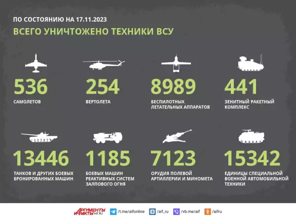 Как сообщает Минобороны РФ, Вооруженные силы с 11 по 17 ноября нанесли 24 групповых удара высокоточным оружием. Поражены в том числе места размещения командного состава ВСУ из состава оперативно-тактической группы «Лиман» и оперативно-стратегической группировки войск «Хортица» украинской армии. В российском военном ведомстве отметили, что в атаке были задействованы беспилотные летательные аппараты. Также были поражены пункты временной дислокации боевиков «Азова» и «Правого сектора» (запрещенных в РФ террористических организаций). Отмечается, что за этот период ВСУ потеряли более 1,1 тысячи военнослужащих только на краснолиманском направлении.