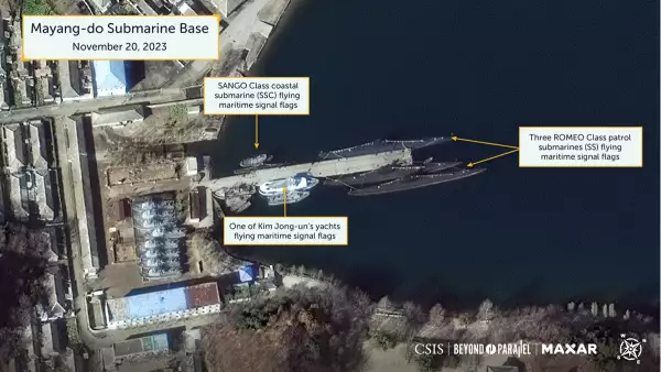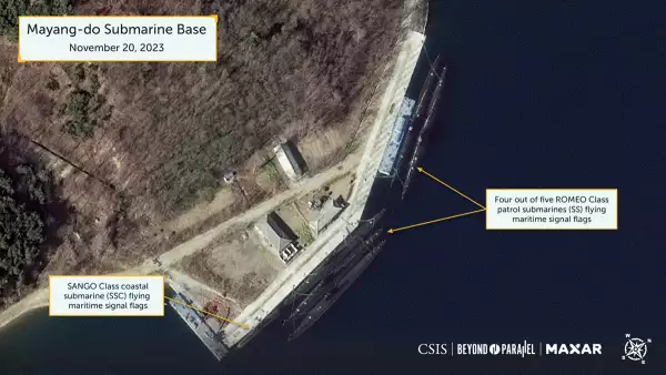 "На базе подводных лодок Маянг-до вот-вот состоится визит высокопоставленного политика или очень важная церемония, о чем свидетельствуют семь патрульных подводных лодок класса ROMEO (SS), две прибрежные подводные лодки класса SANGO (SSC), а также несколько других судов, в том числе одна из личных яхт Ким Чен Ына. На всех судах установлены морские сигнальные флаги"