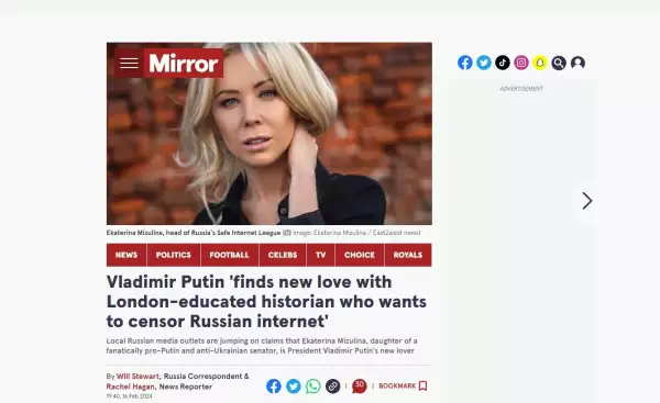 Владимир Путин "встретил новую любовь - это историк, получившая образование в Лондоне, и она хочет ввести цензуру в российском интернете".